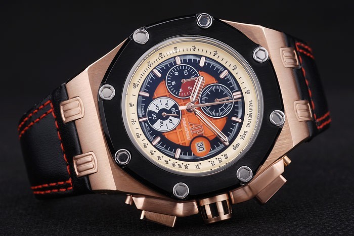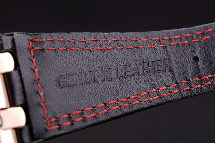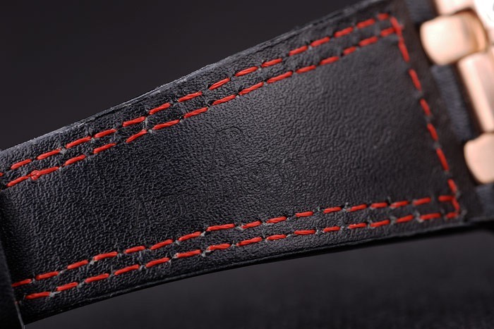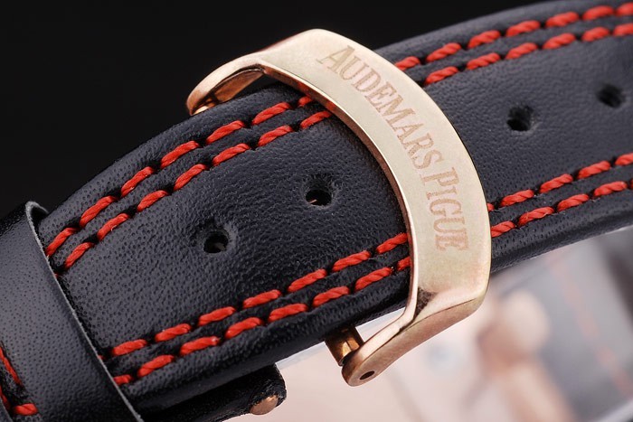 Armband: Wärme Audemars Piguet Swiss Made Logo mit und schwarzem Lederarmband geprägt Doppel rot Fadenheftung und Audemars Piguet graviert rotgoldene Haken-Schnalle clasp