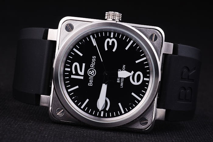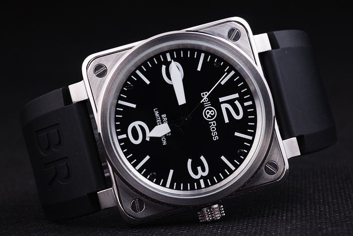 Armband: Schwarzes Kautschukband mit Wärme geprägtes Logo, Modellnummer und Produktcode und BR graviert gebürstetem Edelstahl Haken-Schließe