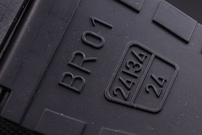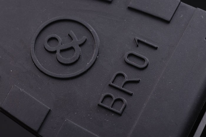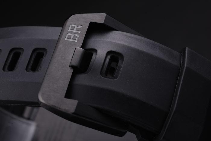 Armband: Schwarzes Kautschukband mit Wärme geprägtes Logo, Modellnummer und Produktcode und BR graviert ionenplattiert Haken-Schließe
