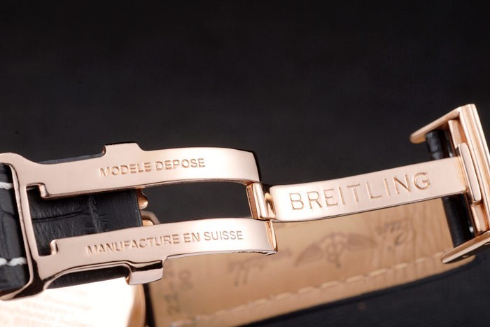 Armband: Schwarz Krokodillederband mit Patent weißen Nähten und Wärme geprägt Breitling Gravuren und graviert 18K Gelbgold überzogen Spange mit Breitling logo auf top