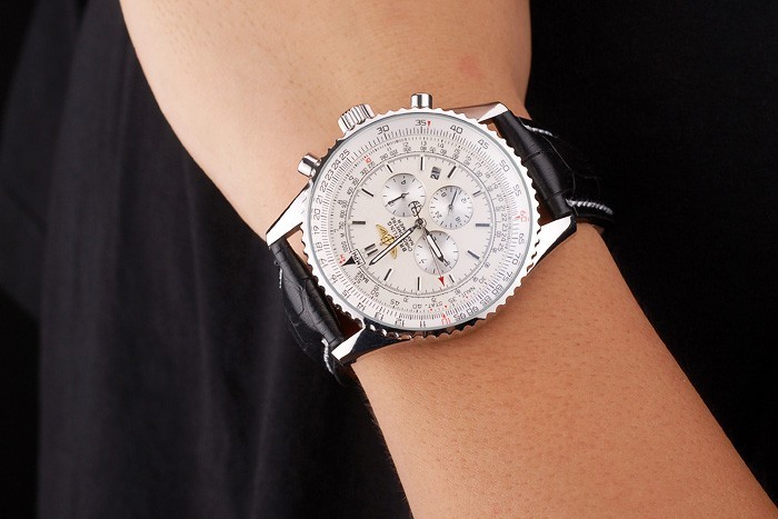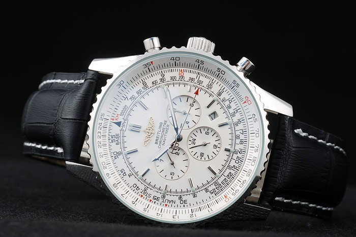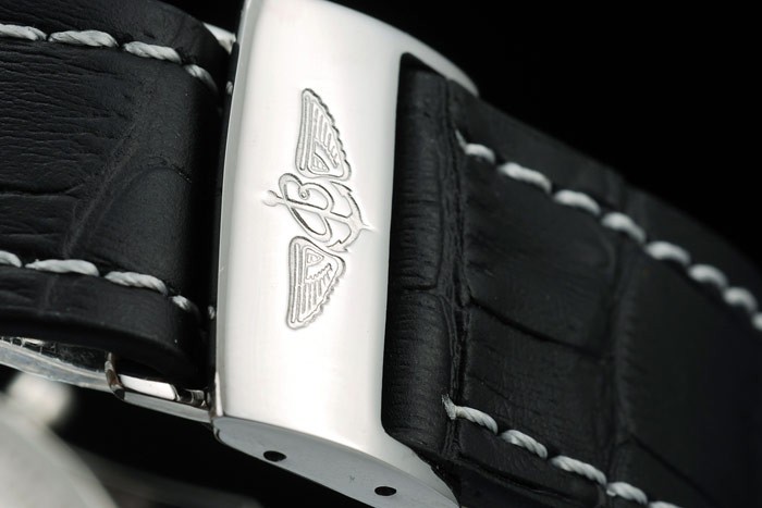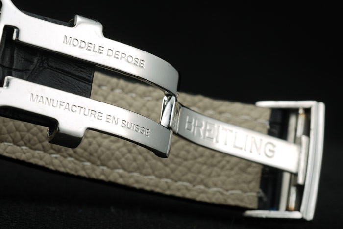 Armband: Schwarzes Krokolederarmband mit Patent weißen Nähten und Wärme geprägt Breitling Gravuren und gravierten Edelstahl falten Verschluss mit Breitling logo auf top