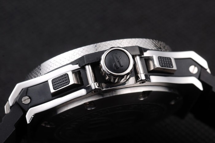 Krone: Cutwork mit ‚H‘ Gravur und zwei auf beiden Seiten rechteckigen Druckknopf Kronen Edelstahl Krone poliert, mit allen besetzt schwarzem Gummi trimmings