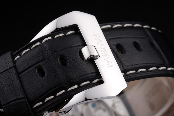 Armband: Schwarz Krokodillederband mit weißen Nähten und Wärme geprägt Officine Panerai Italien Stempel und poliertem Edelstahl Haken-Schließe mit Panerai engraving