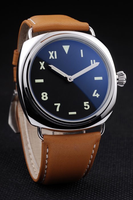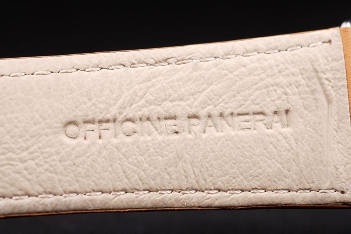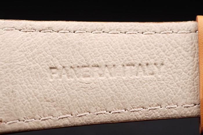 Armband: Hellbraun Lederband mit weißen Nähten und Wärme geprägt Officine Panerai Italien Stempel und poliertem Edelstahl Haken-Schließe mit Panerai engraving