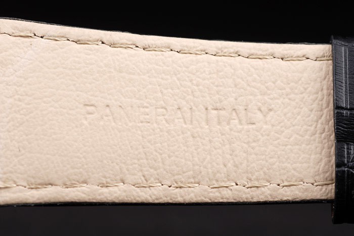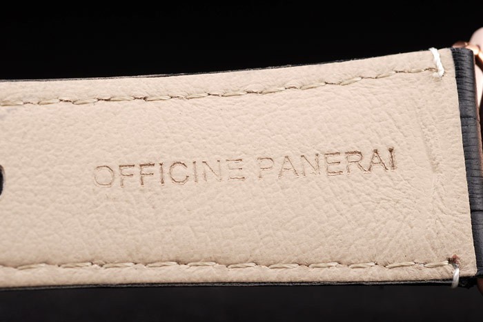 Armband: Schwarz Krokodillederband mit weißen Nähten und Wärme geprägt Officine Panerai Italien Stempel und 18k Rose vergoldet Haken-Schließe mit Panerai engraving