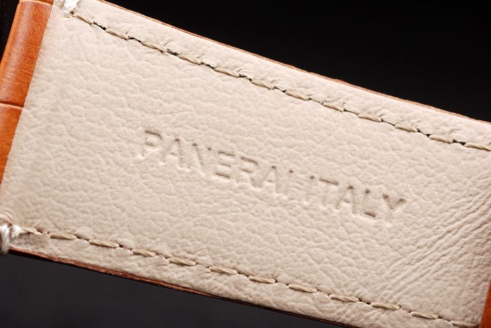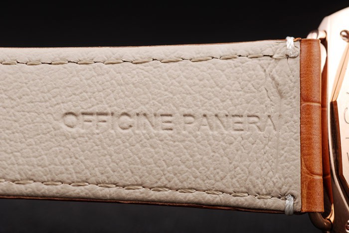Armband: Braun Krokodillederband mit weißen Nähten und Wärme geprägt Officine Panerai Italien Stempel und 18k Rose vergoldet Haken-Schließe mit Panerai engraving