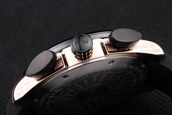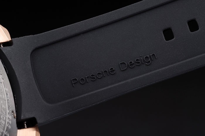 Armband: Reifen-Nut schwarzes Kautschukband mit Hitze geprägten Porsche Stempel und Rose-Gold-Haken-Schließe mit Porsche inscription