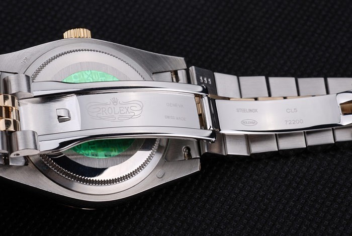 Rückseite: Edelstahl Push-Gehäuseboden mit grünen Rolex-Logo stamp