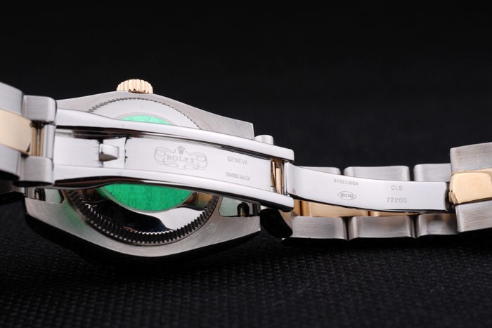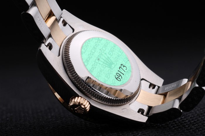 Rückseite: Edelstahl Push-Gehäuseboden mit grünen Rolex-Logo stamp