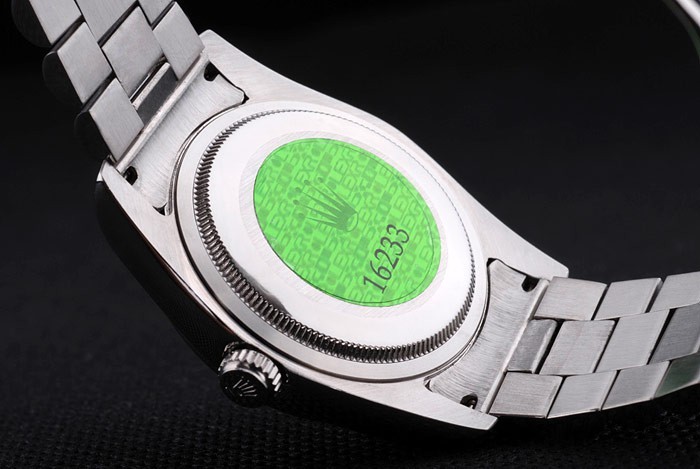 Rückseite: Edelstahl Push-Gehäuseboden mit grünen Rolex-Logo stamp