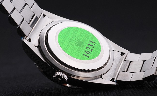 Rückseite: Edelstahl Push-Gehäuseboden mit grünen Rolex-Logo stamp