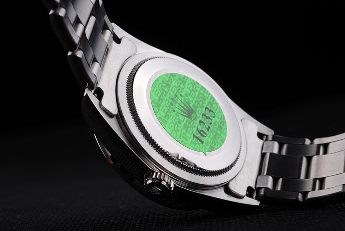 Rückseite: Edelstahl Push-Gehäuseboden mit grünen Rolex-Logo stamp