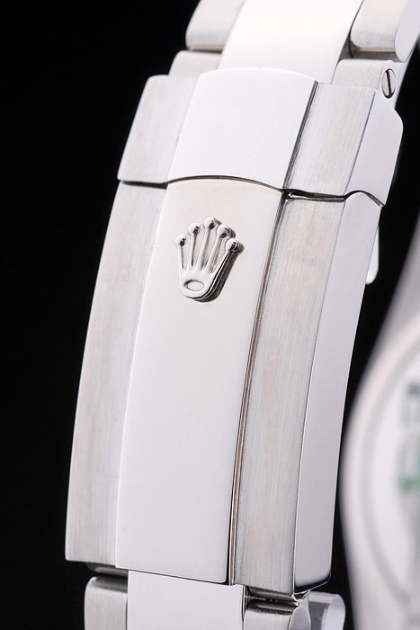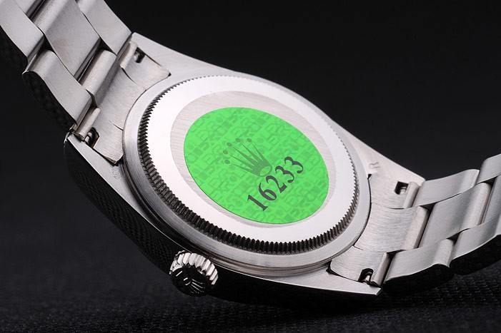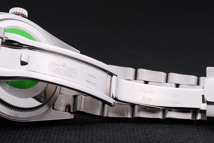 Rückseite: Edelstahl Push-Gehäuseboden mit grünen Rolex Gravur stamp