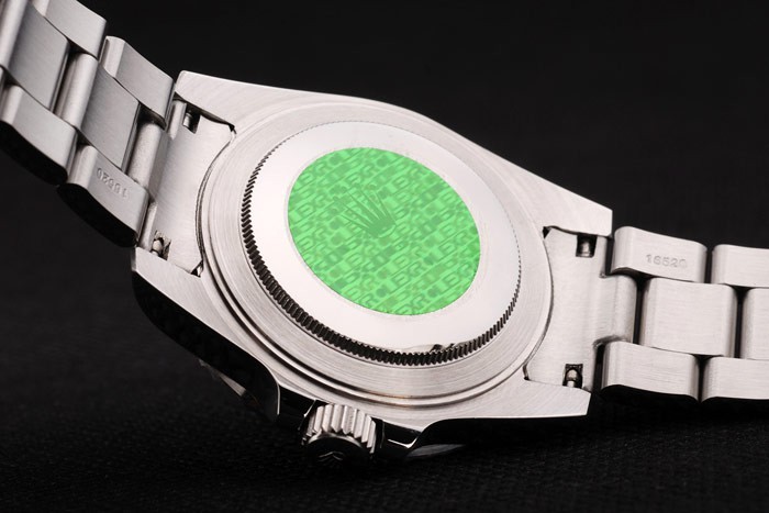 Back Bewegung: Push-in Edelstahl zurück mit grünen Rolex Aufkleber und markings