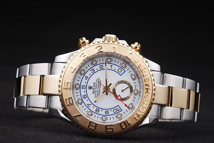 Lünette: Rose vergoldet unidirektionale cutwork Lünette mit 1 bis 10 Markierungen und Yacht Master Gravur auf einem blauen Lack background