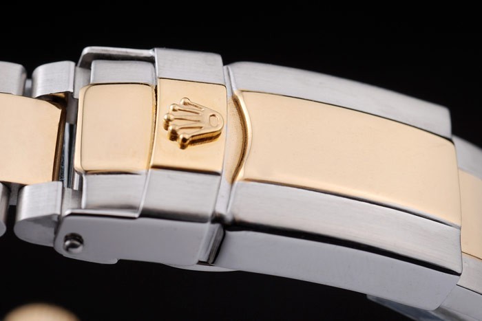 Armband: Edelstahl gebürstet und Rose-Gold-Gliederarmband mit Rolex Gravur im Inneren des Faltschließe und eine Rolex-logo auf top