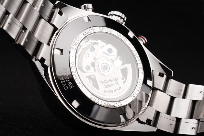 Rückseite: Edelstahl Push mit Mechanik im Rücken enthüllt transparent Zentrum und Tag Heuer engravings