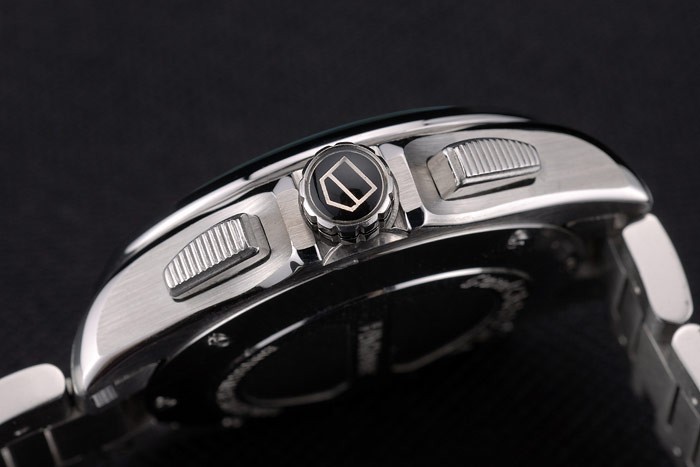 Krone: Edelstahl poliert cutwork Krone mit Tag Heuer-logo und zwei auf der gegenüberliegenden mit einer cutwork Krone auf beiden Seiten davon lange cutwork Kronen Druckknopf entlang side