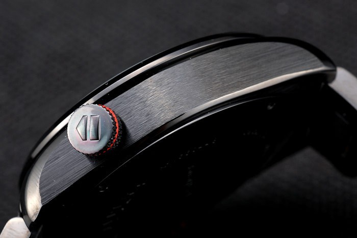 Krone: ionenplattiert cutwork Krone mit Tag Heuer logo und rote Band trimmen und zwei langen Tastendruck Kronen auf beiden Seiten davon sowie ein logo ionenplattiert Krone mit rotem Rand Band auf der gegenüberliegenden oberen corner