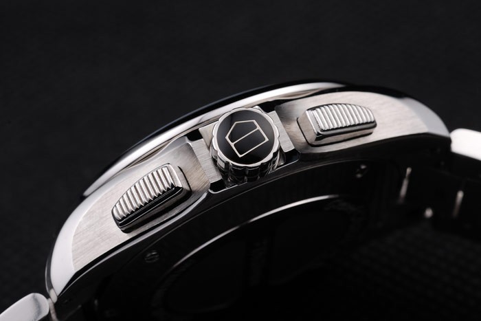 Krone: Edelstahl cutwork Krone mit Tag Heuer-logo schwarze Emaille Stud und zwei langen gerippten Druckknopf Kronen auf entweder Seite davon und einen zusätzlichen Tag Heuer-logo cutwork Krone auf dem oposite side