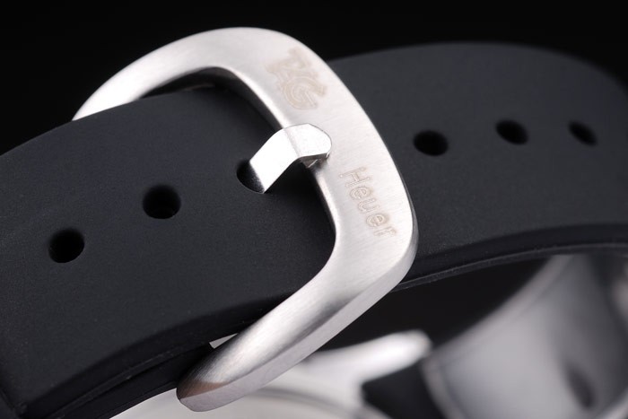 Armband: Schwarzes Kautschukband mit gebürstetem Edelstahl Haken-Schließe mit Tag Heuer inscription